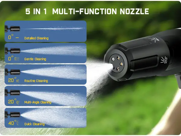 The spray nozzle provides 5 adjustable angles for precise control over the spray direction. To change the spray mode, simply twist the nozzle. This easy adjustment lets you customize the pressure and flow to fit your needs